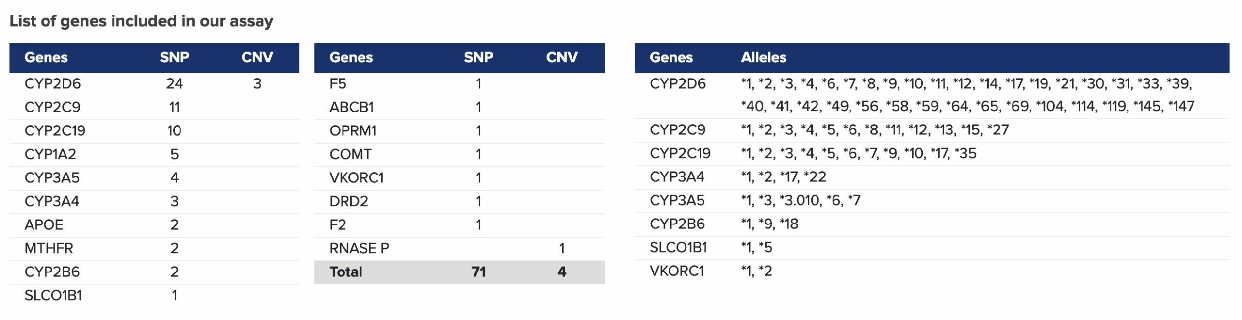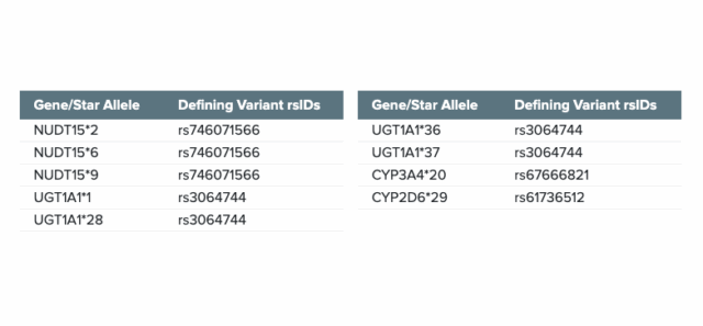 - Targets variants in 17 genes implicated in drug metabolism pathways