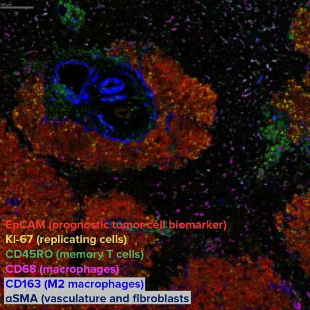 Combining spatial transcriptomics with high-plex proteomic imaging provides a more complete view of tissue biology than either modality alone. Transcriptomic imaging reveals gene expression activity, while proteomics captures functional state – what the cell is actually doing. Because immune cell phenotypes are typically defined by protein expression, not RNA, cell identity can only be inferred from transcripts but is confirmed through protein detection.