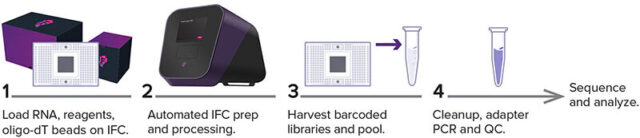 Figure 1. Advanta RNA-Seq NGS XT Library Prep Kit workflow on the Juno system. Samples and Advanta RNA-Seq XT reagents are added to the 48.Atlas IFC, which is subsequently processed on the Juno instrument.