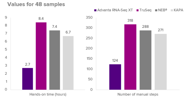 Figure 3. Example comparing hands-on time and number of manual processing steps for several RNA-seq workflows. Comparisons were made between the Advanta RNA-Seq XT NGS Library Prep Kit, TruSeq Stranded mRNA LP, NEBNext Ultra II Directional RNA LP and KAPA mRNA HyperPrep LP. All workflows include quantification of 48 samples by qPCR and pooling to obtain the final library for sequencing. The Advanta RNA-Seq XT workflow using the 48.Atlas IFC with Juno system automation enables substantial hands-on time savings relative to the alternative library prep workflows.