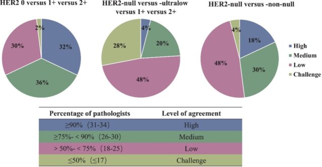 - IHC resulted in poor inter-observer consistency. There is low diagnostic concordance among pathologists using IHC when evaluating HER2-ultralow breast cancer samples (Figure 2). This inconsistent differentiation results in unreliable patient stratification10.