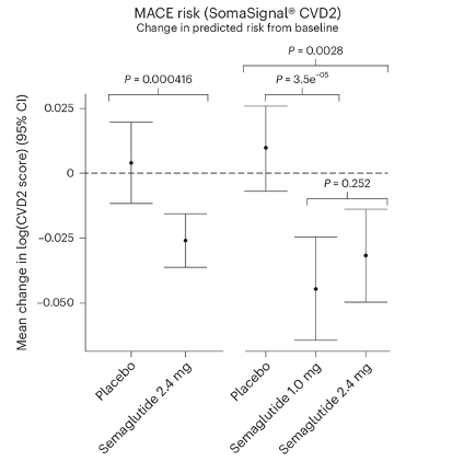 Figure 1. Effect of semaglutide on predicted cardiovascular disease risk in STEP 1 and STEP 2 participants. The data is presented as mean values with error bars indicating 95% confidence intervals. A two-sided test was used.