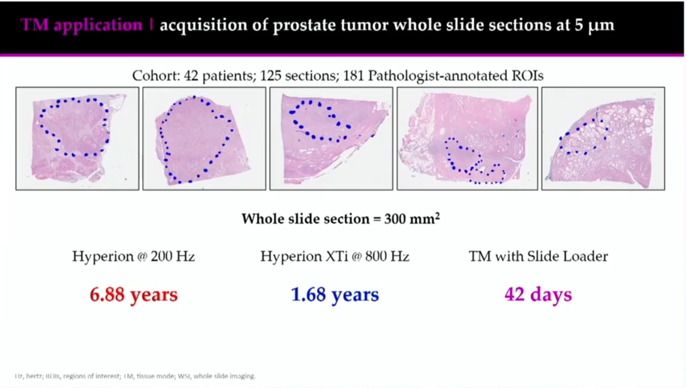 The cohort was large: 125 sections and 181 pathologist-annotated regions of interest (ROIs) from 42 participants. The team wanted to determine the best, most efficient way to image this large cohort. They determined acquisition times for 1 µm and 5 µm resolution imaging and what area of the slides they could image at each resolution, ultimately deciding to raster the data at 5 µm using Tissue Mode and image the entire slide.