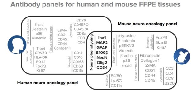 Our high-parameter neuro-oncology panels successfully analyzed the spatial landscape of normal and neoplastic brain tissues, identifying major cell populations such as neurons, astrocytes, microglia and oligodendrocytes. Various tumor cell phenotypes, resident and infiltrating cells and resting and activated microglia were also detected in brain tumor subtypes. Crucially, the spatial positioning of major brain cell types was recognized without any spectral overlap or tissue autofluorescence.