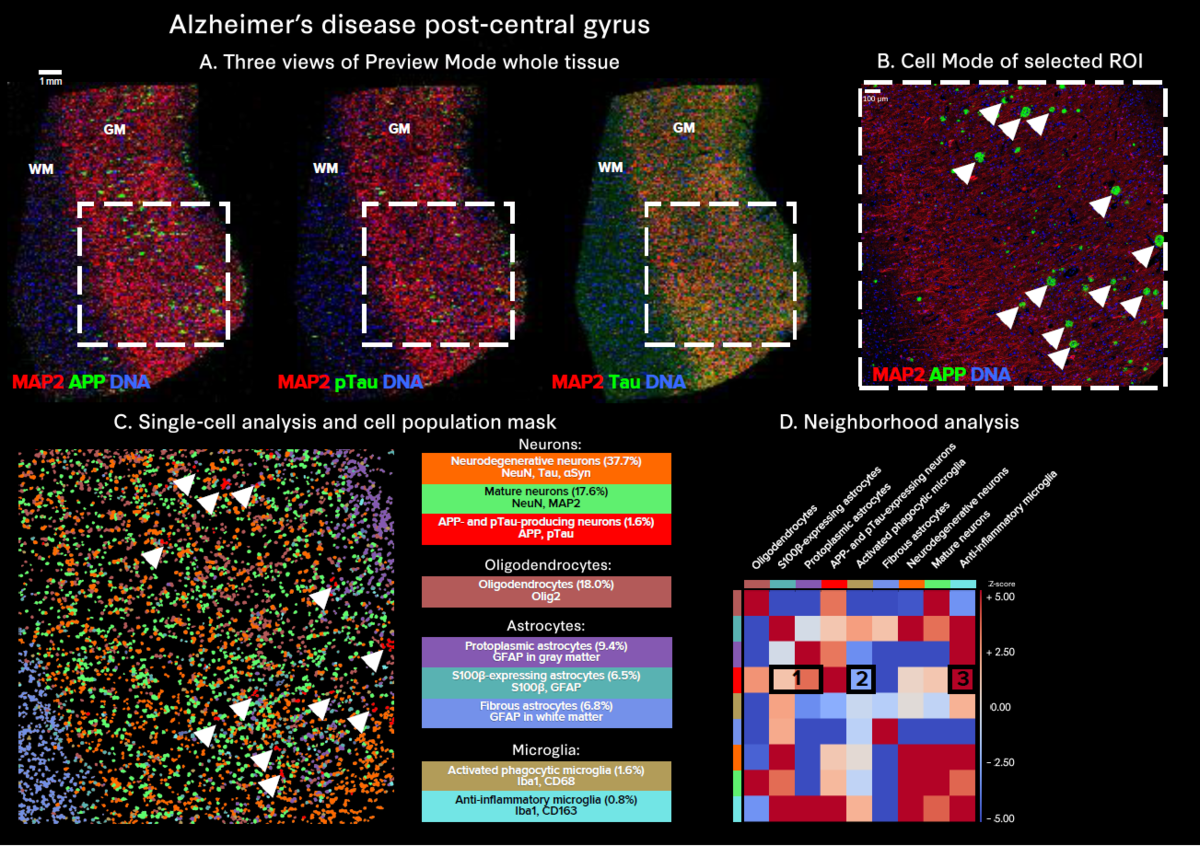 Another set of studies identified and analyzed factors that could initiate early neurodegeneration, using IMC platforms to identify neuronal subtypes associated with Alzheimer’s disease and characterize their morphology and activation. First, characteristics and local pathology involving pTau and β-amyloid (Aβ) associated with vulnerable neurons were investigated, aimed at developing cell type-specific neuroprotective therapies. Further study provided evidence for a functional association between intra-Aβ accumulation and selective neuronal loss arising from intrinsic autophagy-related defects triggering early neurodegeneration. A panel of 31 antibodies for IMC systems generated a single-cell multiplexed protein expression spatial dataset of excitatory and inhibitory neuronal subpopulations, glial cells and disease pathology.