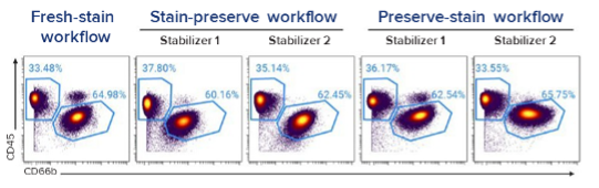 Representative dot plots show the compatibility of the Human Broad Immune Profiling CyTOF Panel, 20 Antibodies with stabilization reagents and sample multiplexing in three different workflows.